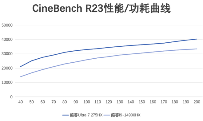 除了性能提升外,酷睿Ultra 9 275HX的能效同样显著提高。以下为CineBench R23测试中,不同功耗下的性能表现对比: