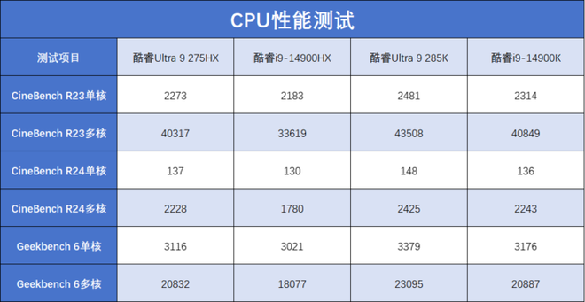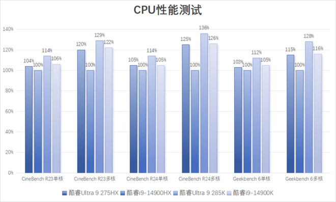 对比前代酷睿i9-14900HX,酷睿Ultra 9 275HX的单核性能领先约5%,多核性能领先约20%。与桌面端处理器相比,它的性能接近功耗较高的酷睿i9-14900K,约为酷睿Ultra 9 285K的90%水平。
