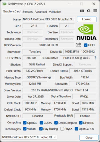 显卡部分,搭载的是RTX 5070Ti笔记本GPU,基于Blackwell架构打造,配备12GB GDDR7显存,5888个CUDA核心,总带宽达672GB/s,AI算力为992TOPS。支持NVIDIA DLSS 4技术,帧到帧间的稳定性得以提升,光照细节增强,并提供更多运动中的细节。