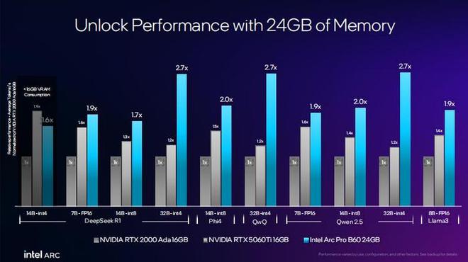 针对大模型训练需求,锐炫Pro B60提供了24GB的大容量显存,能够轻松应对DeepSeek R1、Phi4、QwQ、Qwen及Llama3等主流大模型的推理任务。相比竞品,其生成速度最高领先2.7倍,展现出卓越的计算能力。