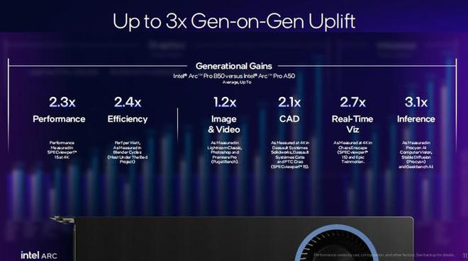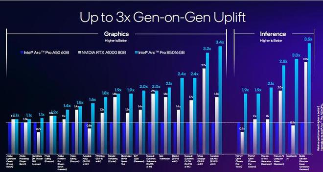 值得注意的是,锐炫Pro B50不仅在性能上显著超越前代产品,在与竞争对手NVIDIA RTX A1000 8GB的对比中同样表现出色。特别是在实际应用场景中,如3D建模渲染和复杂数据分析任务,其效率提升尤为明显。