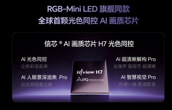 尽管非顶级旗舰,但海信U7Q搭载了旗舰同款RGB-Mini LED芯片——信芯AI画质芯片H7,基于算力升级与星海大模型深度训练,首次实现“控光+控色”协同优化。