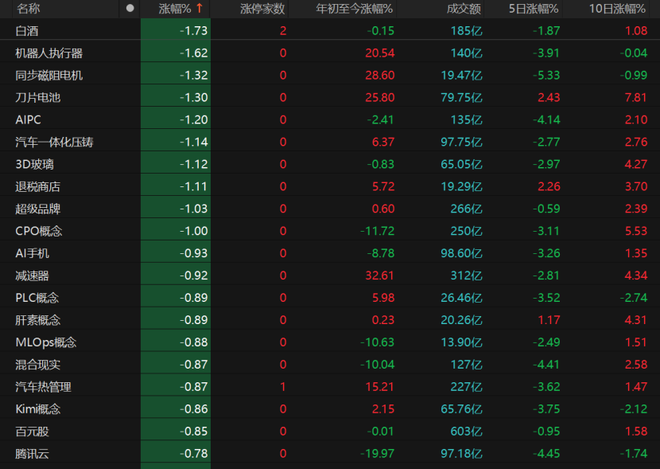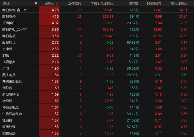 从概念板块来看,重组蛋白概念板块涨幅超过4%,ST股概念涨幅超过2%。白酒、机器人执行器、刀片电池、汽车一体化压铸概念板块则领跌。