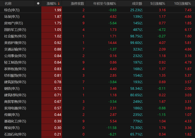 近期A股市场呈现出明显的横盘震荡和板块轮动特征。今日综合、环保、房地产板块涨幅接近2%,国防军工、社会服务、美容护理等板块也有不错表现,而上周五领涨的汽车板块出现回调。