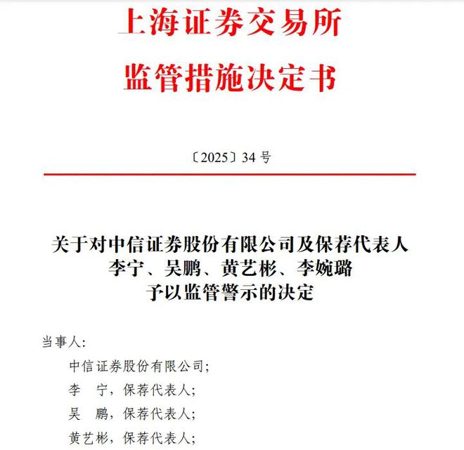 为此,上交所分别对中信证券及其4名保代(李宁、吴鹏、黄艺彬、李婉璐),以及国投证券及其2名保代(郑扬、陈实)予以监管警示。此外,深交所也在2024年9月至11月期间,因中信证券与国投证券在IPO项目中的多项违规行为,采取了书面警示措施。